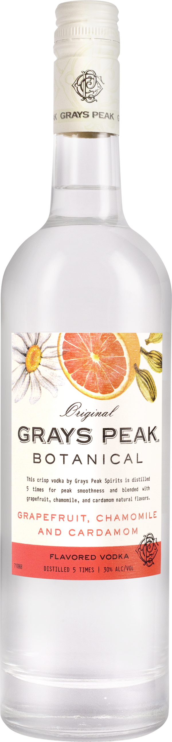 "This crisp vodka by Grays Peak Spirits is distilled 5 times for peak smoothness and blended with natural flavors of grapefruit, chamomile, and cardamom." Tasting Notes