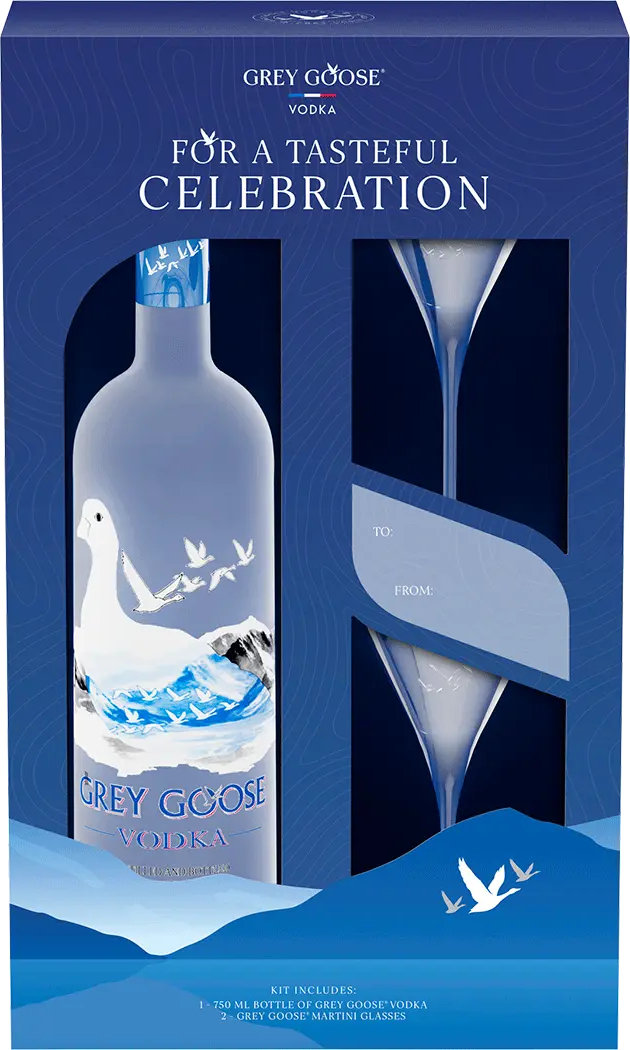 "Each batch of Grey Goose begins with soft winter wheat grown on farms in Northern France. After the wheat grain is fermented and distilled into a high-proof spirit it is blended with pristine water from the Cognac region. The palate is initially soft with a gentle sweetness that gradually envelops the mouth-smooth and rounded texture with a hint of almond and a long, satisfying finish." Tasting Notes Gift set includes one 750ml bottle and two Martini Glasses.