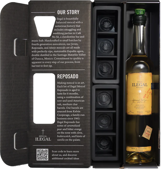 "Aged to taste for 6 months. Caramelized pear and bitter orange on the nose. Clove, butterscotch, and hints of vanilla on the palate. The Reposado Ice Tray Kit contains a 750ml bottle of mezcal reposado and two 2" branded ice tray kits. Ice trays make six cubes, perfect for reposado on the rocks." Producer Notes