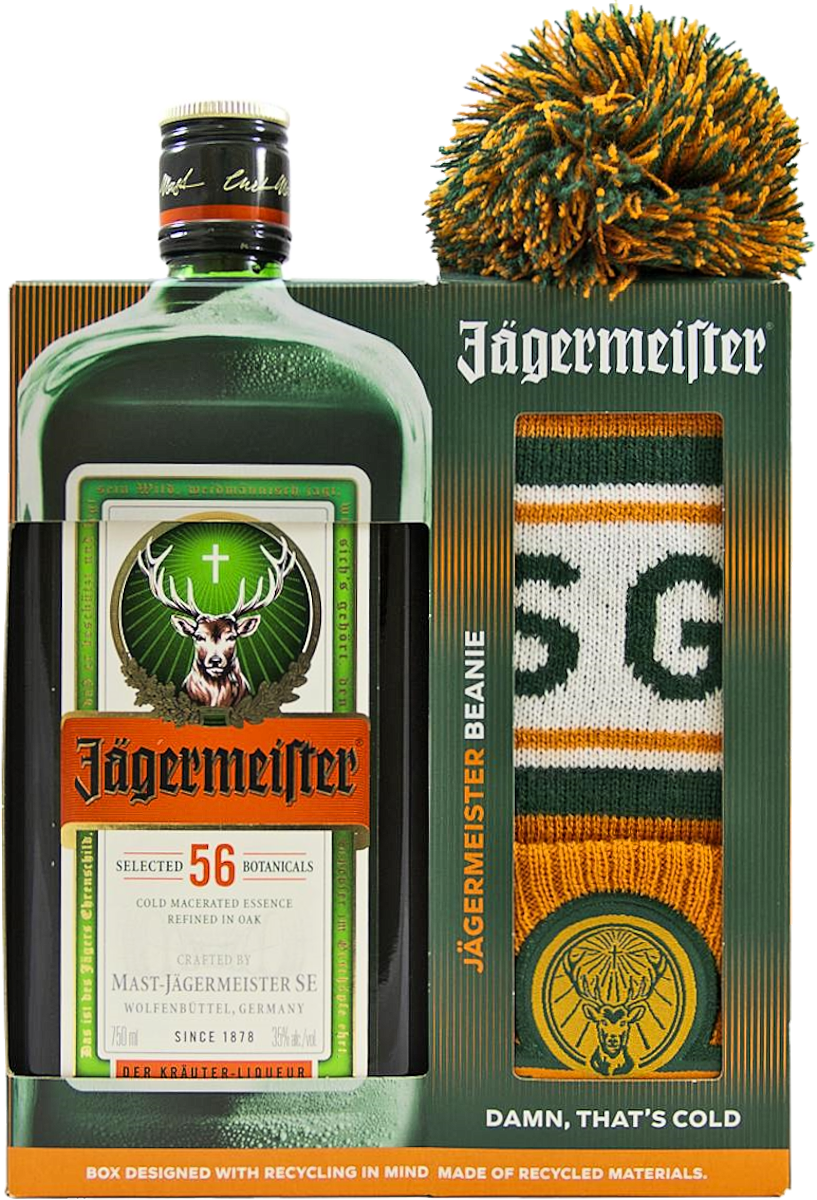 "A German bitter liqueur that is a complex blend of 56 herbs, fruits and spices. It should be served icy cold to tame its assertive herbal flavor." Tasting Notes Gift set includes one 750ml bottle of Jagermeister and a Jagermeister branded beanie.