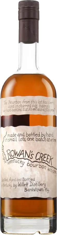"Rowan's Creek is stored in charred oak barrels. It is hand bottled at 50.05% alc./vol. (100.1 proof)...made and bottled by hand, in small lots, one batch at a time. This Bourbon takes its namesake from the creek that still runs through our distillery...carrying the best limestone spring water there ever was for making good Bourbon, so you know the whiskey makin' is still going on. Try a sip of it, straight up in a snifter, or add a dab of branch water if you like." Tasting Notes