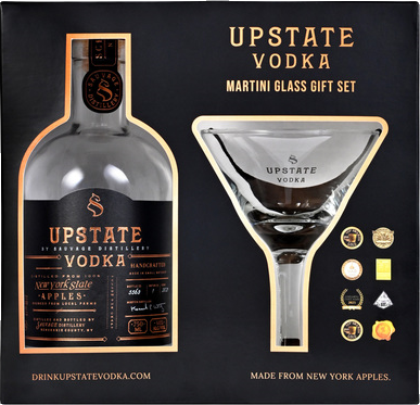 "Handcrafted in small batches and all natural, this award winning vodka is Certified Gluten Free and Kosher. Upstate Vodka is living proof that you can create an outstanding vodka from apples. Every bottle contains 70 to 80 apples from local New York state farms. Fermented, distilled, and bottled under one roof, Upstate has a unique, light, crisp mouthfeel." Tasting Notes Gift set includes one 750ml bottle and one martini glass.